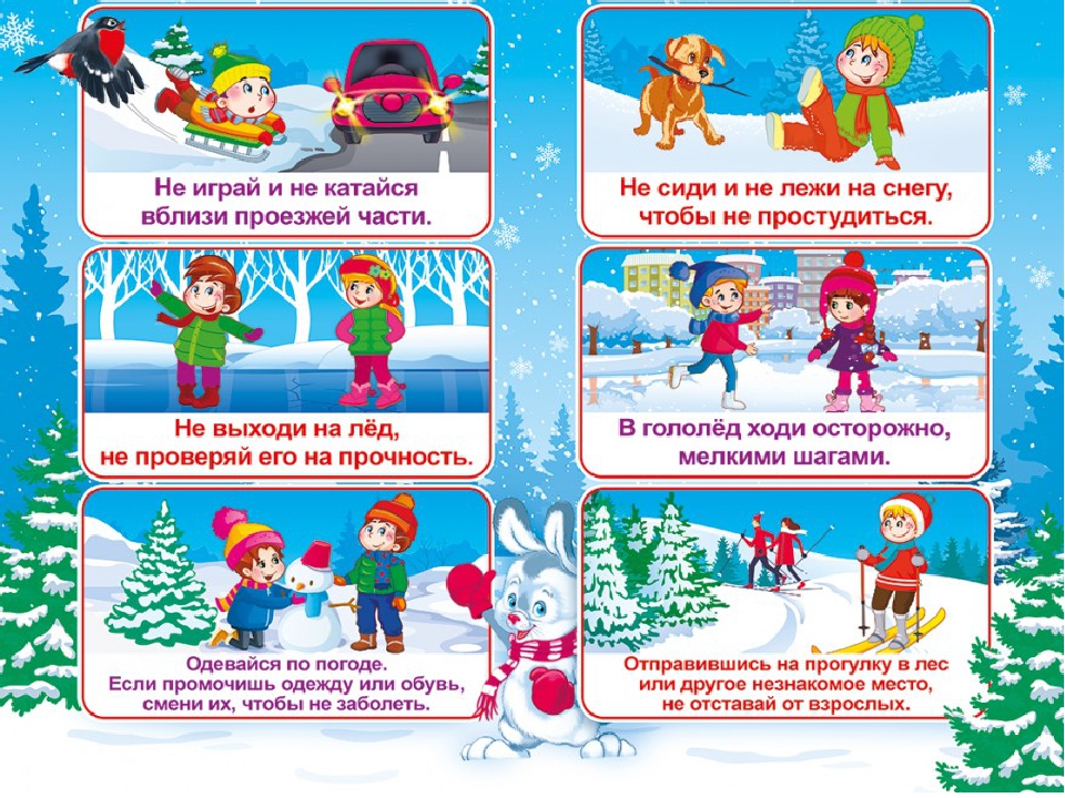 — кататься на коньках, лыжах можно только в специально отведенных для этого местах. Кататься на санках стоя нельзя! И нельзя кататься с горок, которые расположены рядом с дорогой! Вести себя на горке нужно аккуратно и дисциплинированно, не толкаться. Опасно привязывать санки друг к другу.